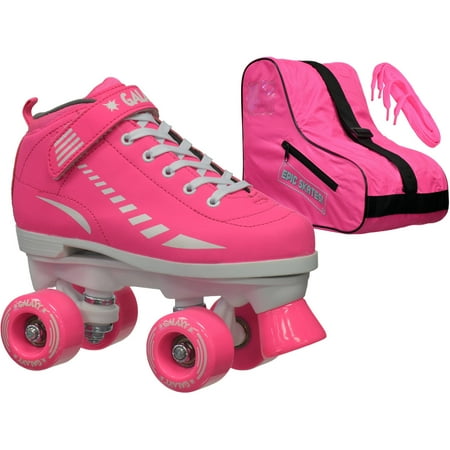 Epic Galaxy Elite Pink Speed Roller Skates Package: Epic skate bag: matching color2 pair of laces: black and matching colorComfortable padded bootMid top boot designColorful man-made uppersPink with white highlightsPlates: Epic nylonLightweight nylonDouble action trucksWhite with white cushionsWheels: Epic galaxyQuad roller skate wheelsPolyurethane compoundPink with whiteFor use on indoor and outdoor surfacesBearings: Epic ABEC-58mm axle sizePrecision speed bearingsToe stops: Epic fixed toe stopsNon-adjustable toe stopsNon-marking compoundWhite, kids sizesEpic skates run true to sizeFor more information regarding sizing please visit our website at www