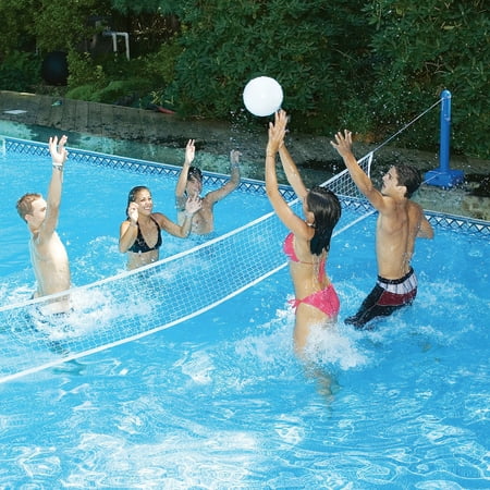 Accommodates swimming pools up to 20 ft wide and includes a heavy duty net, and real feel volleyball game ball