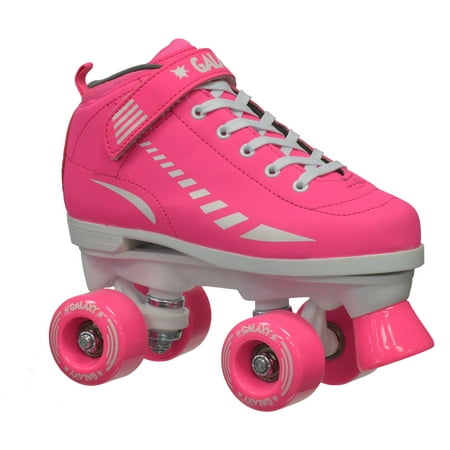 Epic Galaxy Elite Pink Quad Speed Roller Skates: Comfortable padded bootMid top boot designColorful man-made uppersPink with white highlightsPlates: Epic nylonLightweight nylonDouble action trucksWhite with white cushionsWheels: Epic galaxyQuad roller skate wheelsPolyurethane compoundPink with whiteFor use on indoor and outdoor surfacesBearings: Epic ABEC-38mm axle sizePrecision speed bearingsToe stops: Epic fixed toe stopsNon-adjustable toe stopsNon-marking compoundWhite, kids sizesEpic skates run true to sizeFor more information regarding sizing please visit our website at www