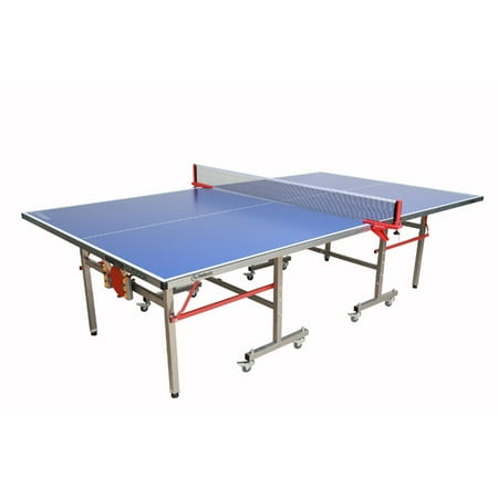 This indoor table tennis table is equipped with a blue 7/8-inch MDF core table top and steel table base