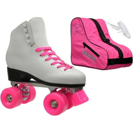 Epic Classic White/Pink Quad Roller Skates Package: Epic skate bag: matching color2 pair of laces: white and matching colorClassic roller skate designComfortable man-made uppersAll white boot with black solePlates: Epic aluminumLightweight aluminumDouble action trucksPink cushionsWheels: Epic trailblazerOutdoor quad roller skate wheelsPolyurethane compoundPinkFor use on outdoor surfacesBearings: Epic ABEC-58mm axle sizePrecision speed bearingsToe stops: Epic fixed toe stopsNon-adjustable toe stopsNon-marking compoundPinkEpic skates run true to sizeFor more information regarding sizing please visit our website at www